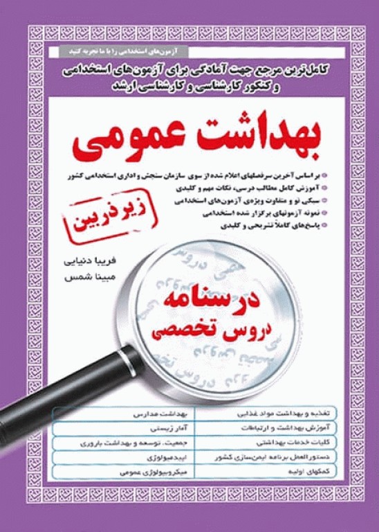 کتاب استخدامی بهداشت عمومی زیر ذربین اثر فریبا دنیایی و مبینا شمس نشر آیین طب و پرستش کاملترین مرجع جهت آمادگی برای آزمونهای استخدامی و کنکور کارشناسی و کارشناسی ارشد شامل مباحث تخصصی آزمون استخدامی بهداشت عمومی میباشد. در این کتاب سعی شده است کلیه مطالب به طور چکیده و کاربردی، با هدف افزایش سطح داوطلبان در پاسخدهی به سوالات آزمونهای استخدامی تهیه شود. هرفصل به صورت مجزا حاوی چکیده و نکات برتر به همراه سوالات برای داوطلبان آزمونهای استخدامی تنظیم آزمونهای استخدامی تنظیم گردیده است.